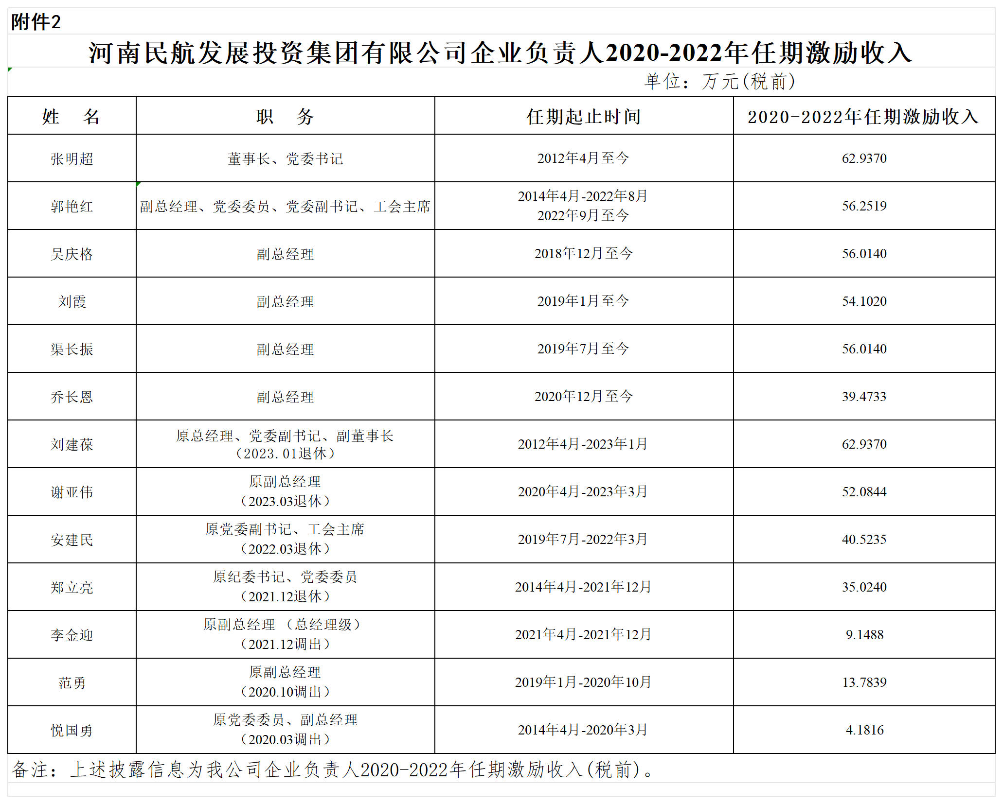 河南民航發展投資集團有限公司企業負責人2022年度薪酬及2020-2022年任期激勵收入情況